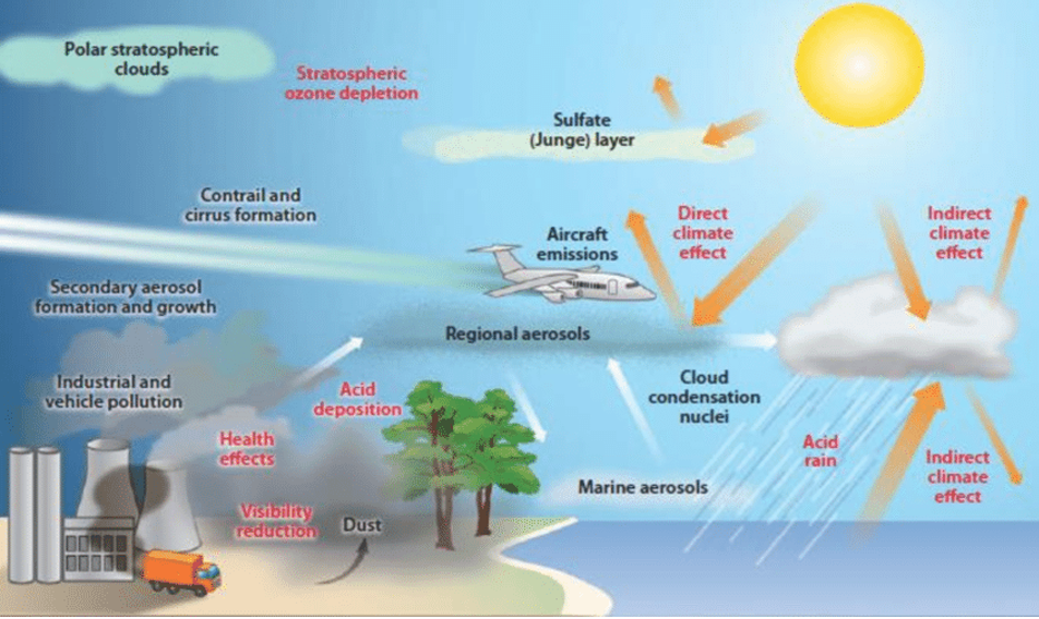 8) Atmospheric Aerosol Loading: Aerosols can cause great harm to the environment. As aerosols enter the atmosphere and interact with water vapor, they impact atmospheric circulation and cloud formation. Aerosols also alter the amount of solar radiation absorbed or reflected in the atmosphere. The release of atmospheric pollutants from places like factories can release polluting gases that turn into particles and droplets. Land-use changes also cause smoke and dust to enter the atmosphere. Every year, about 800,000 people prematurely pass away due to the inhalation of polluted air.