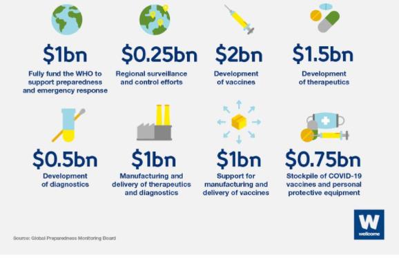 More investment in vaccines, treatments and diagnostics is urgently needed if we are to have the best chance of saving lives and bringing this pandemic to an end. At least $8 billion is required to fund research, development and distribution of treatments for all, as well as support for public health measures in the poorest countries. (Wellcome, 2020).