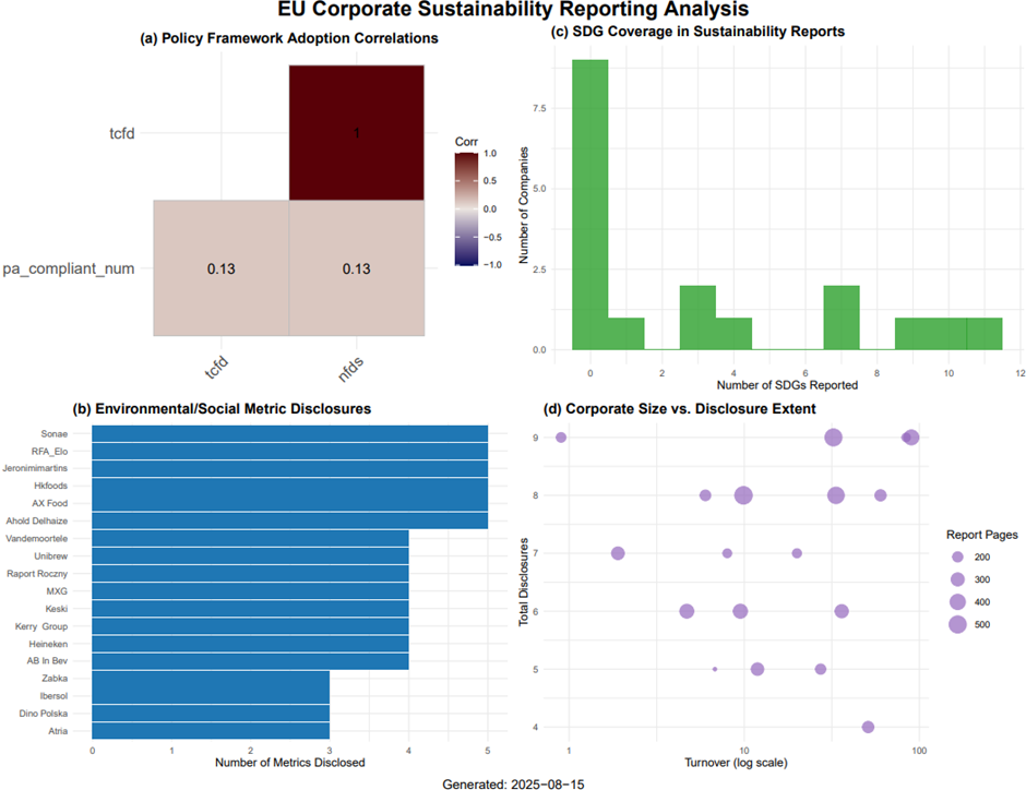 🔍 Adoption Patterns: A positive correlation (0.13) between TCFD (Task Force on Climate-related Financial Disclosures) and Paris Agreement (PA) compliance suggests that companies engaging with one framework are somewhat more likely to adopt the other.