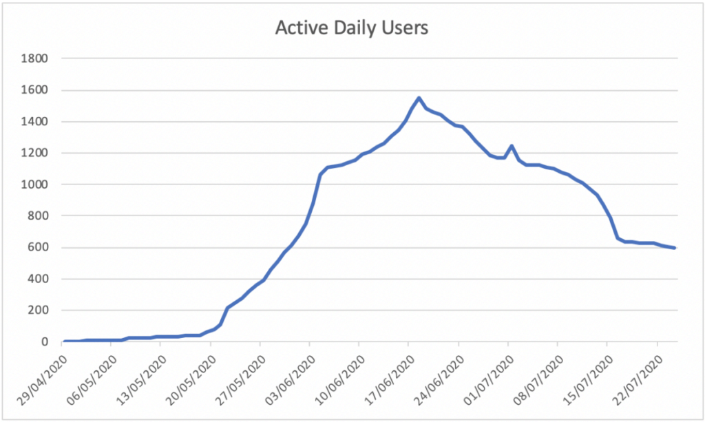 The graph above displays the total number of daily active users to the Climate Security website. Daily active users reached its peak at approx. 1500 users on 18/06/2020. There was a common theme found when analysing the data of users - when there was intensive social media promotion or events being held, daily active users of the site soared in comparison to times of relative inactivity among the Climate Security team.
